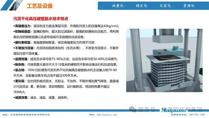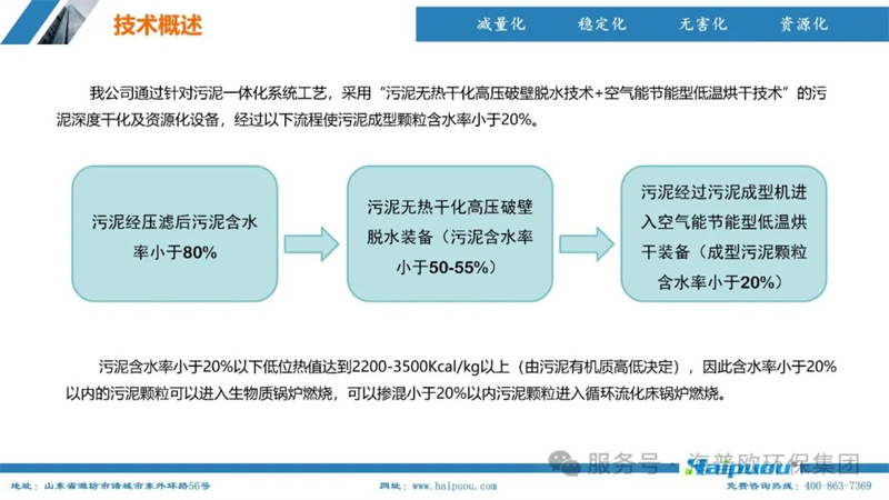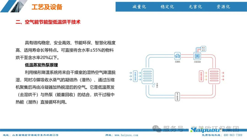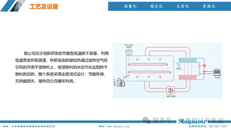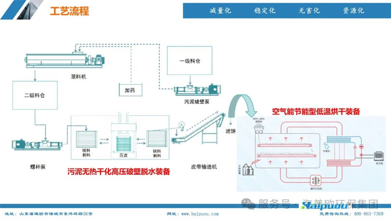 海普歐環(huán)保的核心技術(shù)——污泥深度干化及資源化設(shè)備,采用了“污泥無熱干化高壓破壁脫水技術(shù)+空氣能節(jié)能型低溫烘干技術(shù)”。這一技術(shù)組合能夠?qū)⒑省?5%的物料烘干至含水率20%以下,為污泥的后續(xù)資源化利用提供了堅實的技術(shù)支撐。其中,污泥無熱干化高壓破壁脫水技術(shù)通過自主研發(fā)的高壓破壁泵,在污泥輸送過程中完成壓力破壁,破壞污泥中微生物細(xì)胞的細(xì)胞膜,使內(nèi)部小分子滲出變?yōu)橥獠克,增加污泥的流動性,便于脫水。而空氣能?jié)能型低溫烘干技術(shù)則利用低溫蒸發(fā)熱泵原理,將濕熱空氣降溫脫濕,同時冷媒吸收水蒸氣的凝結(jié)熱,通過壓縮機聚集后再由冷凝器加熱脫濕后的空氣,實現(xiàn)熱能的循環(huán)利用,具有節(jié)能環(huán)保、安全高效、智慧化程度高等特點