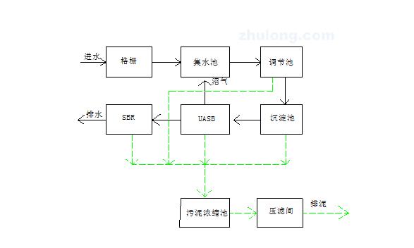 果汁廢水先經(jīng)過中格柵去除大雜質(zhì)后進(jìn)入集水池,用污水泵將廢水提升至調(diào)節(jié)池,在調(diào)節(jié)池進(jìn)行水質(zhì)水量的調(diào)節(jié)。進(jìn)入調(diào)節(jié)池前,根據(jù)在線PH計的PH值用計量泵將堿性水送入調(diào)節(jié)池,調(diào)節(jié)池的PH值在6.5~7.5之間。調(diào)節(jié)池中出來的水用泵連續(xù)送入混凝沉淀池,在混凝沉淀池中進(jìn)行混凝,然后用水泵將水送入UASB反應(yīng)器進(jìn)行厭氧消化,降低有機(jī)物濃度。厭氧處理過程中產(chǎn)生的沼氣被收集到沼氣柜。UASB反應(yīng)器內(nèi)的污水流入SBR池中進(jìn)行好氧處理,而后達(dá)標(biāo)出水。來自,調(diào)節(jié)池,混凝沉淀池,UASB反應(yīng)器、SBR反應(yīng)池的剩余污泥先收集到集泥井,在由污泥提升泵提升到污泥濃縮池內(nèi)被濃縮,濃縮后進(jìn)入污泥脫水機(jī)房,進(jìn)一步降低污泥的含水率,實現(xiàn)污泥的減量化。污泥脫水后形成泥餅,裝車外運(yùn)處置。
