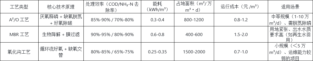 不同污水處理工藝在處理效率、能耗、占地面積、運(yùn)行成本等方面差異顯著,需根據(jù)污水類型、處理規(guī)模、排放標(biāo)準(zhǔn)等因素科學(xué)選型。以下針對生活污水、工業(yè)廢水、高濃度有機(jī)廢水三類場景,對比主流工藝的核心特性: