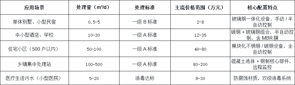 結(jié)合上述因素,我們整理了不同場景下設(shè)備的主流價(jià)格范圍(含設(shè)備本體、安裝調(diào)試,不含土建及管網(wǎng)),供采購方初步預(yù)算參考: