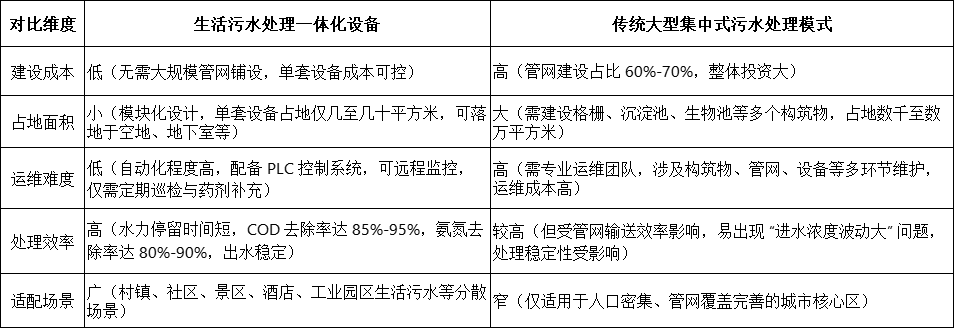 相較于傳統(tǒng)污水處理模式,生活污水處理一體化設(shè)備在技術(shù)、經(jīng)濟(jì)、運(yùn)維等多維度均展現(xiàn)出顯著優(yōu)勢(shì),完美適配分散場(chǎng)景的治理需求: