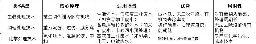 不同類型的污水(生活污水、工業(yè)廢水、農(nóng)業(yè)污水)水質(zhì)差異大,需匹配針對(duì)性技術(shù)。以下為三類主流技術(shù)的適用場(chǎng)景與優(yōu)勢(shì)對(duì)比: