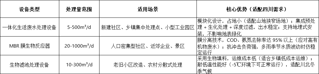 不同應(yīng)用場景(如新建社區(qū)、老舊小區(qū)改造、鄉(xiāng)鎮(zhèn)集中處理、小型企業(yè))對處理量、運維難度的需求不同,四川市場主流設(shè)備可分為 3 類,其適用場景與核心優(yōu)勢如下: