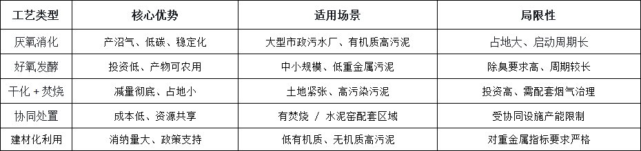 不同工藝在投資、運行成本、適用場景上差異顯著,選型需結(jié)合污泥性質(zhì)、場地、環(huán)保要求綜合判斷。