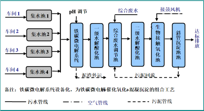 各類生產線的廢水進行單獨收集,之后統(tǒng)一送入初調節(jié)池中進行水質的調節(jié);預處理采用“鐵碳微電解+催化氧化+混凝沉淀”工藝,沉淀溢流到一級水解酸化池中,之后流入到綜合調節(jié)池中,與生活污水、清潔下水混合后,送入二級水解酸化池,水解后出水至生物接觸氧化池中進行好氧處理,處理后水進入沉淀池中,上清液排放。
